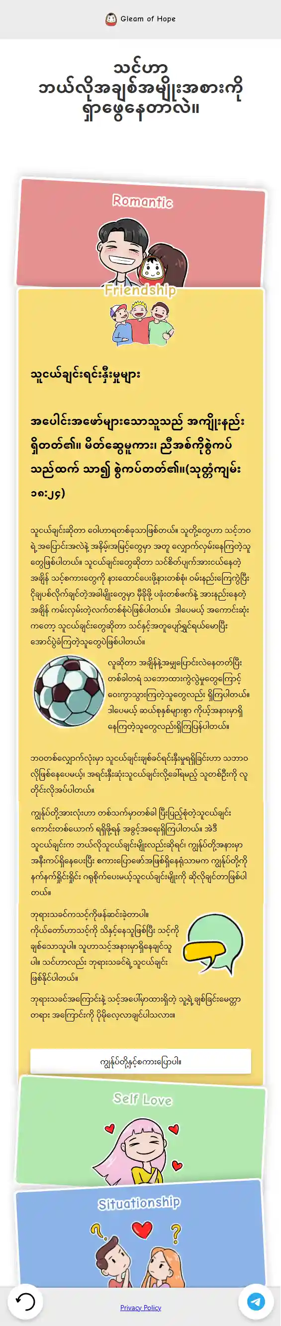 Gleam of Hope is a quiz-based site for teens in Myanmar and the Philippines, aiming to validate their relational struggles and guide them to relationship with God. Users interact with character animation and a familiar card-game design.gleamofhope.co